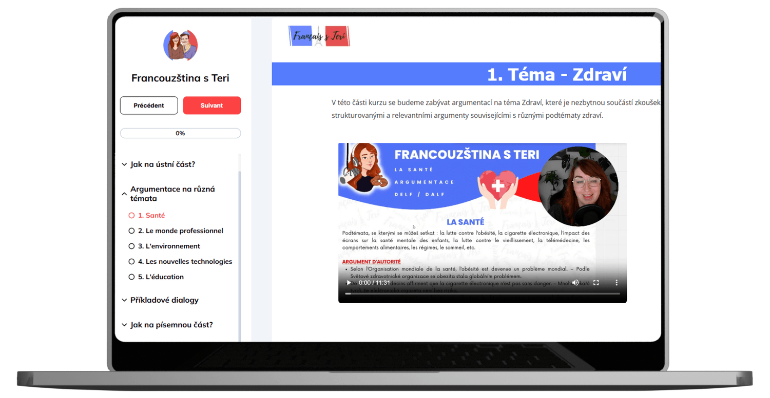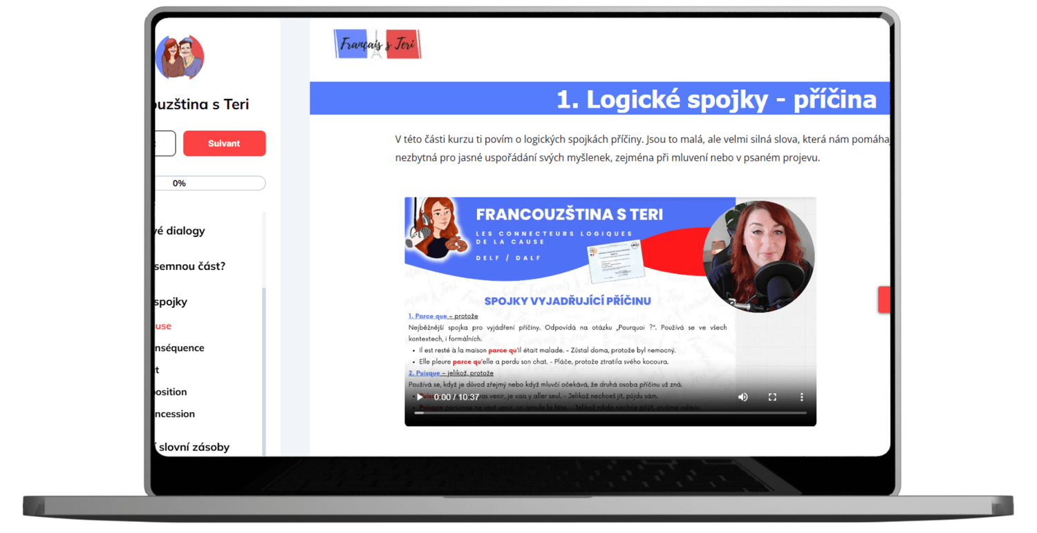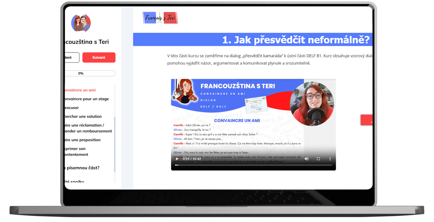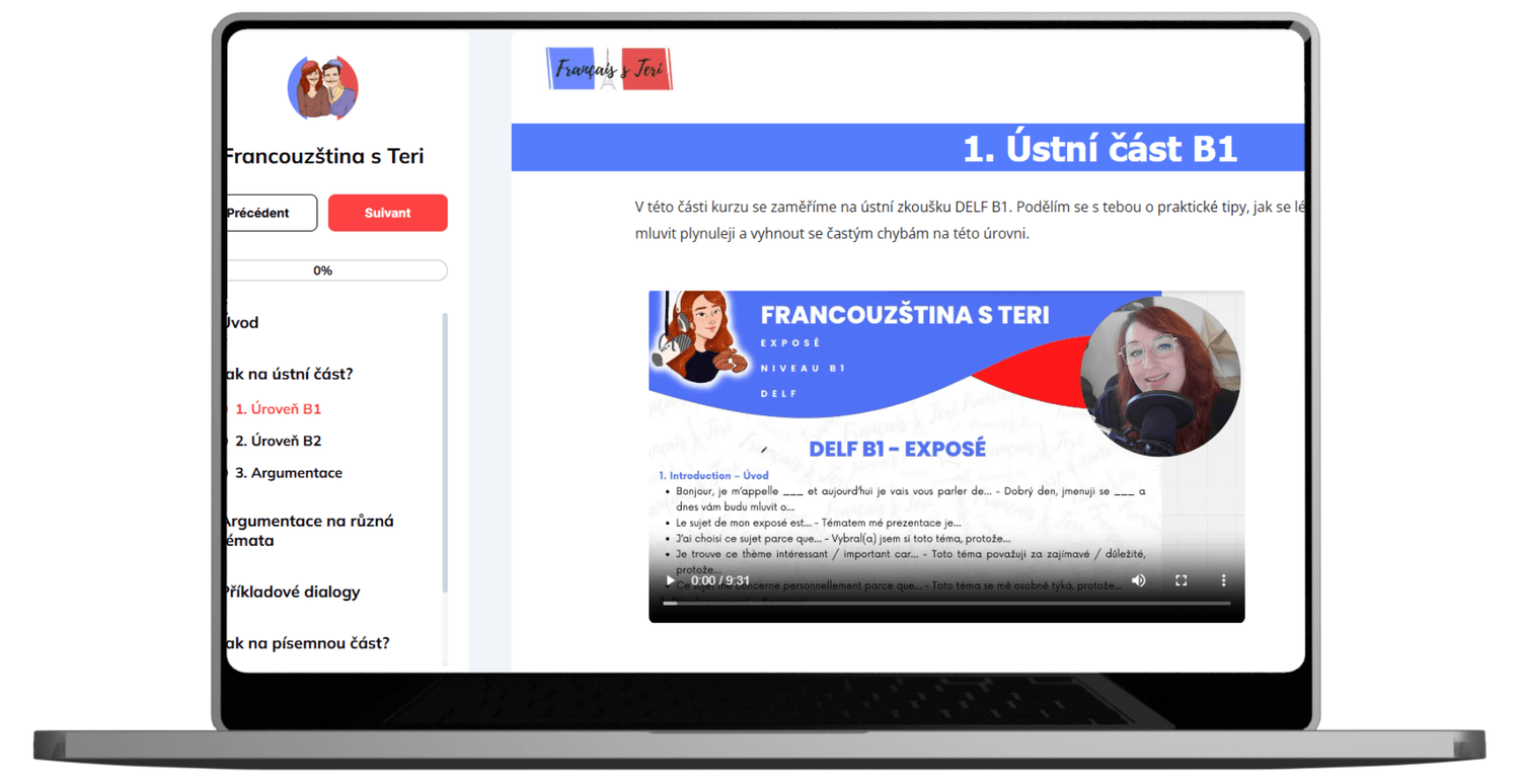 Zapomeň na učení „pro pocit, že něco umíš“. Tenhle kurz je postavený úplně jinak — vznikal ve spolupráci s Francouzkou, která je zkoušející u certifikátů DELF a DALF, takže přesně víš, co se u zkoušky skutečně hodnotí a kde se berou body. Studenti totiž často nepropadají proto, že by neuměli francouzsky, ale proto, že nerozumí pravidlům hry — mluví bez struktury, neumí argumentovat a ztrácí body na detailech, které jim nikdo nikdy nevysvětlil. Proto jsem vytvořila systém, který ti ukáže, jak přemýšlí zkoušející a jak se dostat na úroveň B1, B2 nebo C1.
