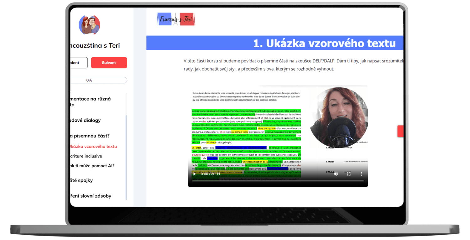 V této části pochopíš, co odlišuje průměrný text od textu, který získává vysoké hodnocení. Naučíš se analyzovat vzorové texty a pochopíš, jak přemýšlí zkoušející, díky čemuž začneš psát strategicky a efektivně. Seznámíš se také s écriture inclusive a naučíš se, jak využít umělou inteligenci při přípravě tak, aby ti skutečně pomohla zlepšit výsledek.